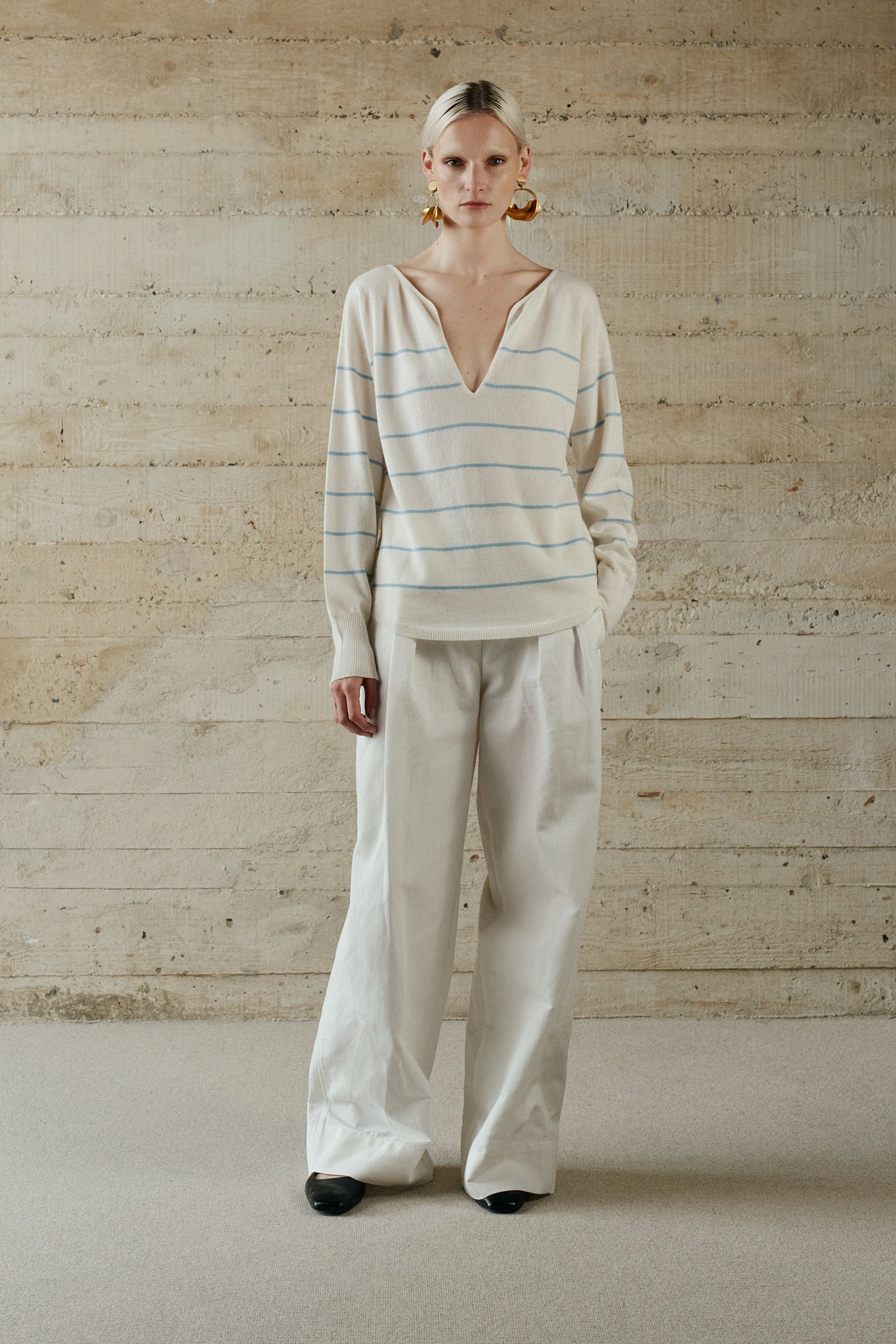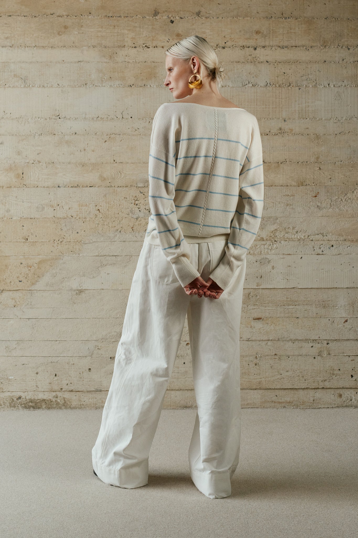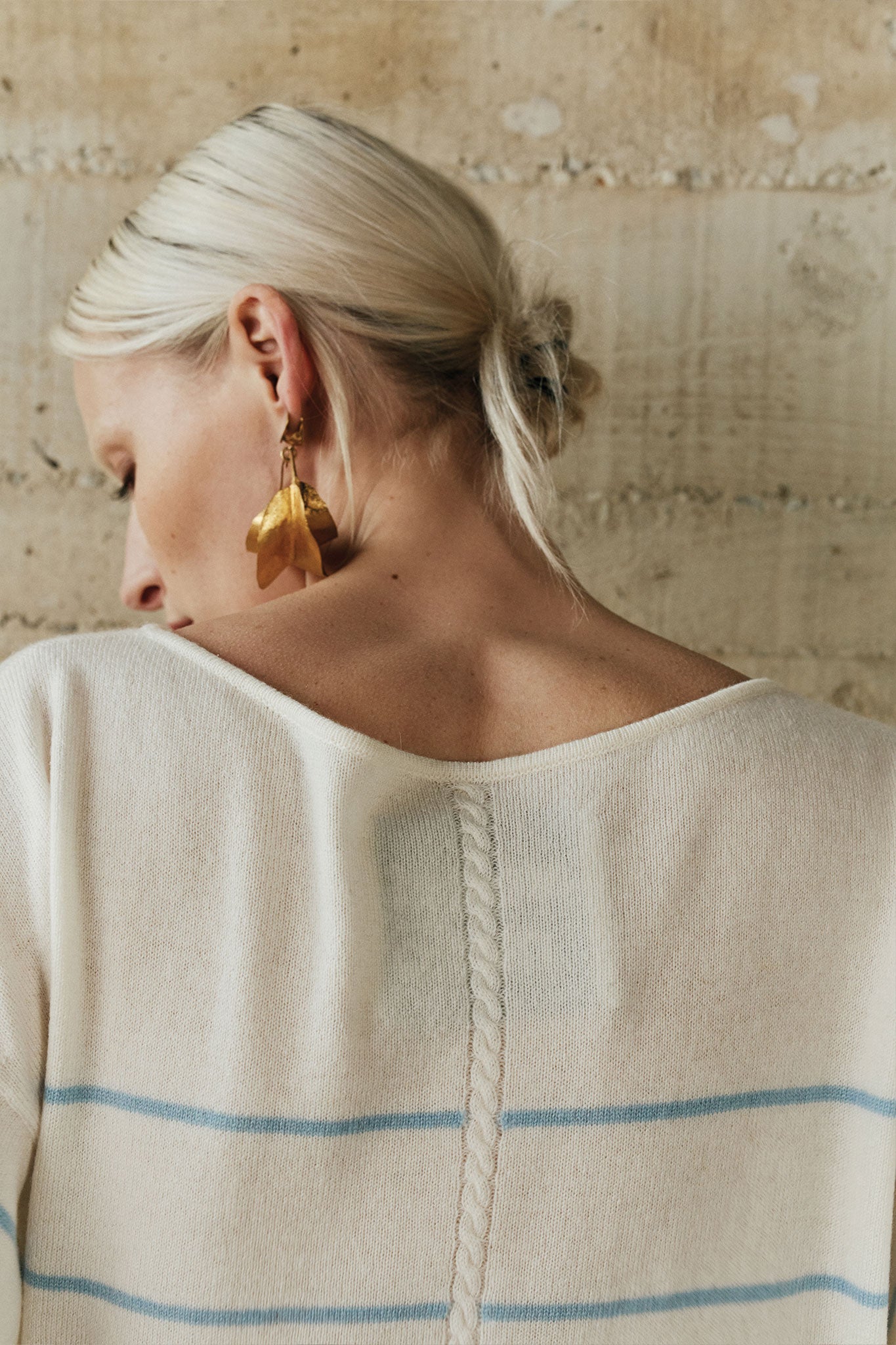 Behold BARI in its Marinière Edition, a vision of coastal elegance woven from 100% sustainable cashmere. Inspired by the rhythmic lapping of ocean waves and the crisp sea breeze, this timeless piece combines the serene hues of cream and sky blue. Its V-neckline, a gateway to nautical allure, beckons with whispered promises of seaside adventures. Casual yet refined, with braided details tracing stories of timeless beauty amidst the gentle sway of the sea.