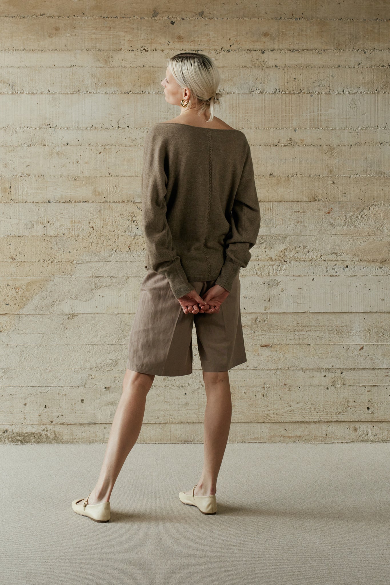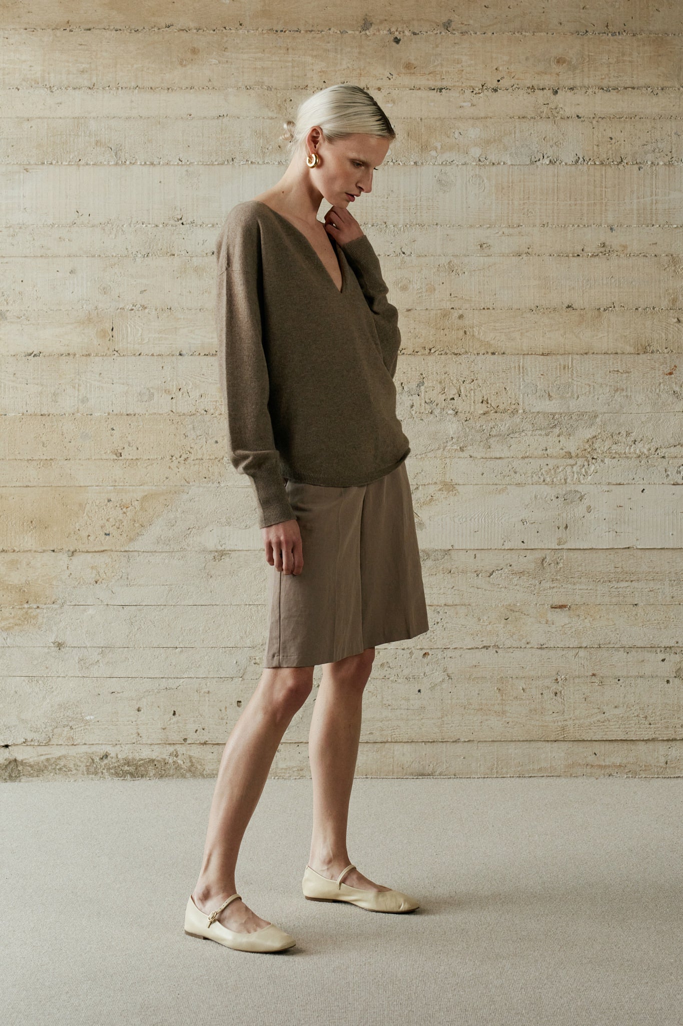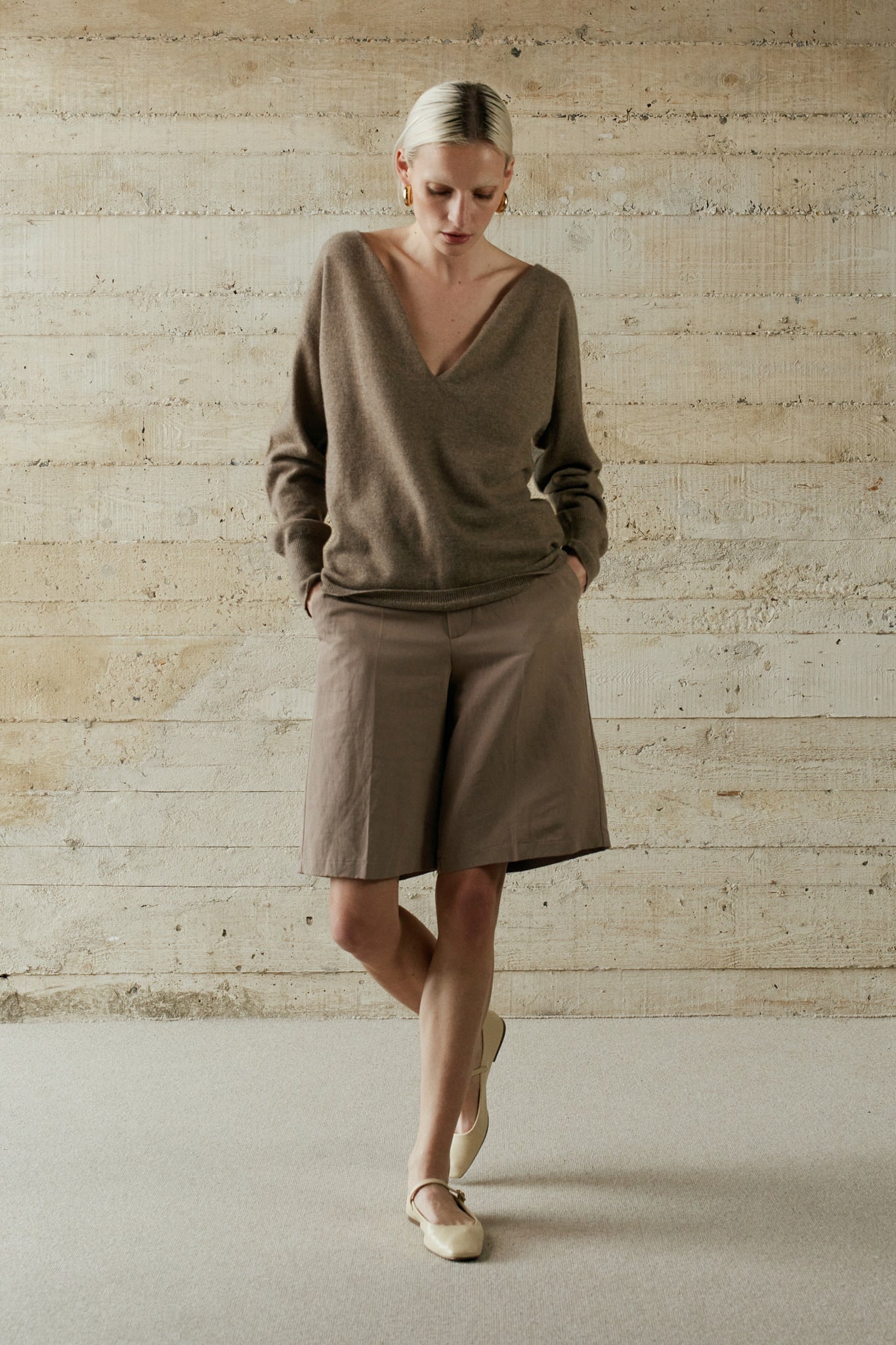 Behold BARI, a vision of sustainable elegance, knitted from 100% sustainable cashmere. Its V-neckline, a gateway to feminine allure, beckons with whispered promises of grace. Casual yet refined, with braided details tracing stories of timeless beauty.