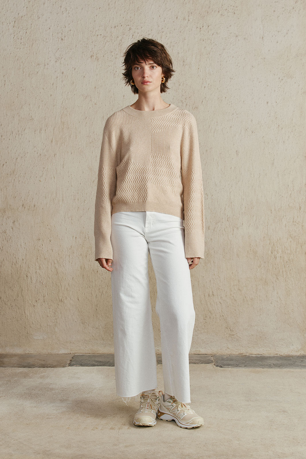 BAYAN, a sanctuary of sustainable luxury, unveils a sweater crafted from the timeless essence of nature - 100% sustainable cashmere. Its wide round neckline and kimono-inspired sleeves dance with the breeze of effortless elegance. Bold graphics whisper tales of courage and grace.