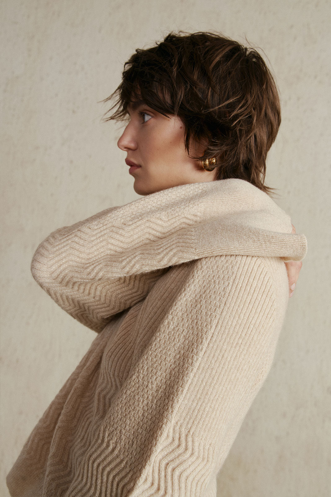 This piece is made from 100% organic cashmere. The yarn is produced by nomadic herder families living in Mongolia. We have collaborated with Eetei Baylag which ensures that the herders are properly remunerated, that the animals are cared for and that the soil is not degraded in order to preserve the ecosystem that supports our high quality standards. The yarns are made directly from the goat's down, without colouring or dyeing, so the colours correspond to the original colours of the goat's down for an effect as close to natural as possible.